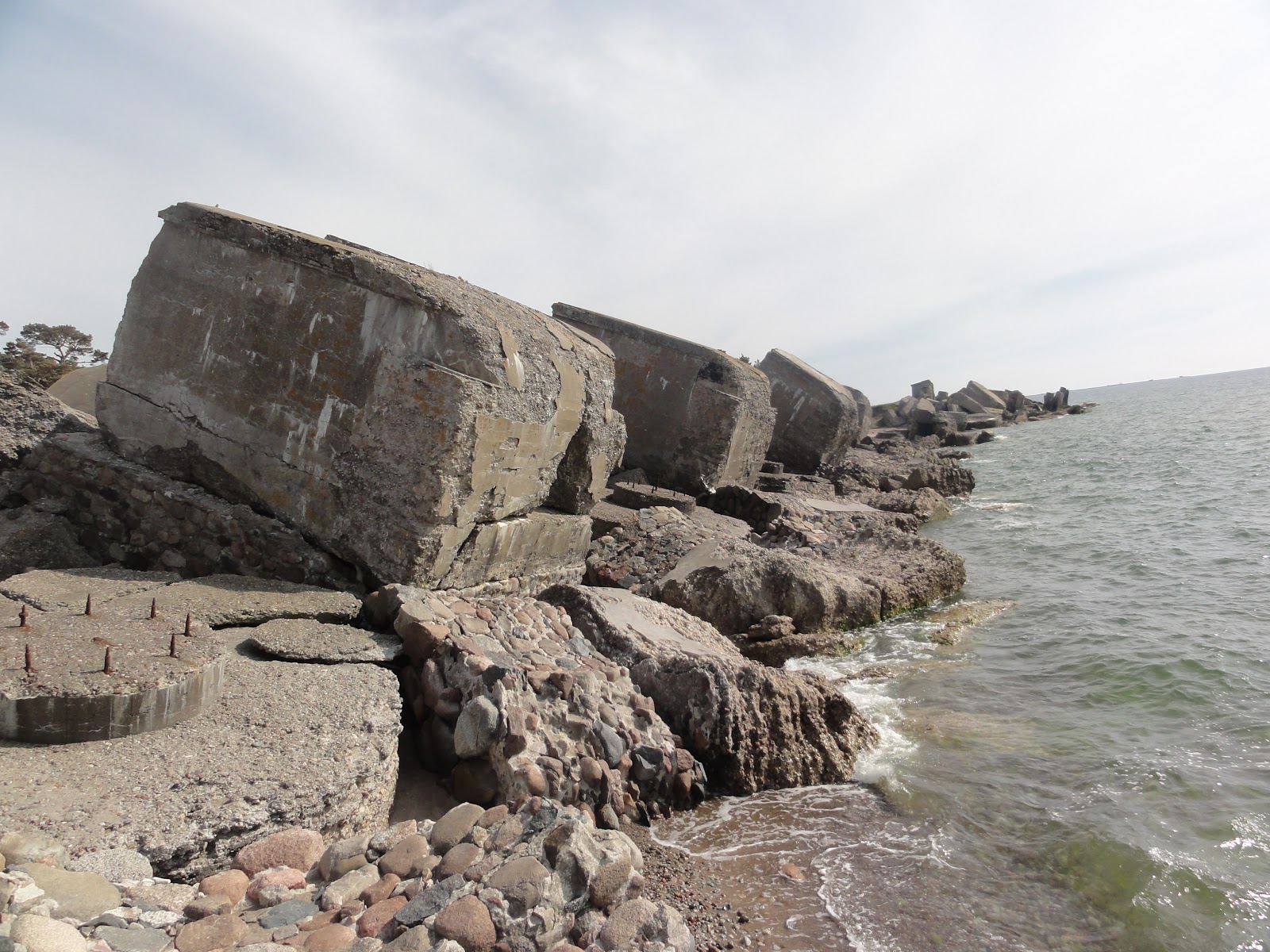 | Ряд разрушенных и съехавших в море погребов. На переднем плане слева - основание орудия |